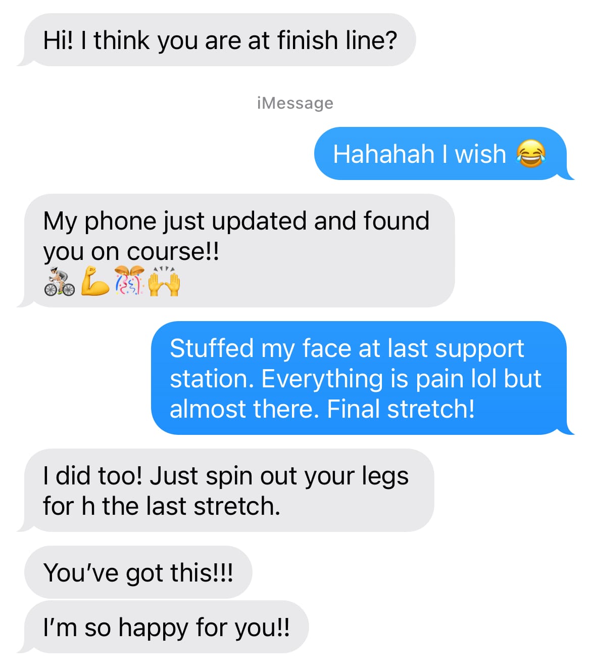 At the last aid station, I checked my phone — my Find My Friends location had glitched. My crew thought I was already at the finish line. Got a little message of support that boosted me through the city highway.