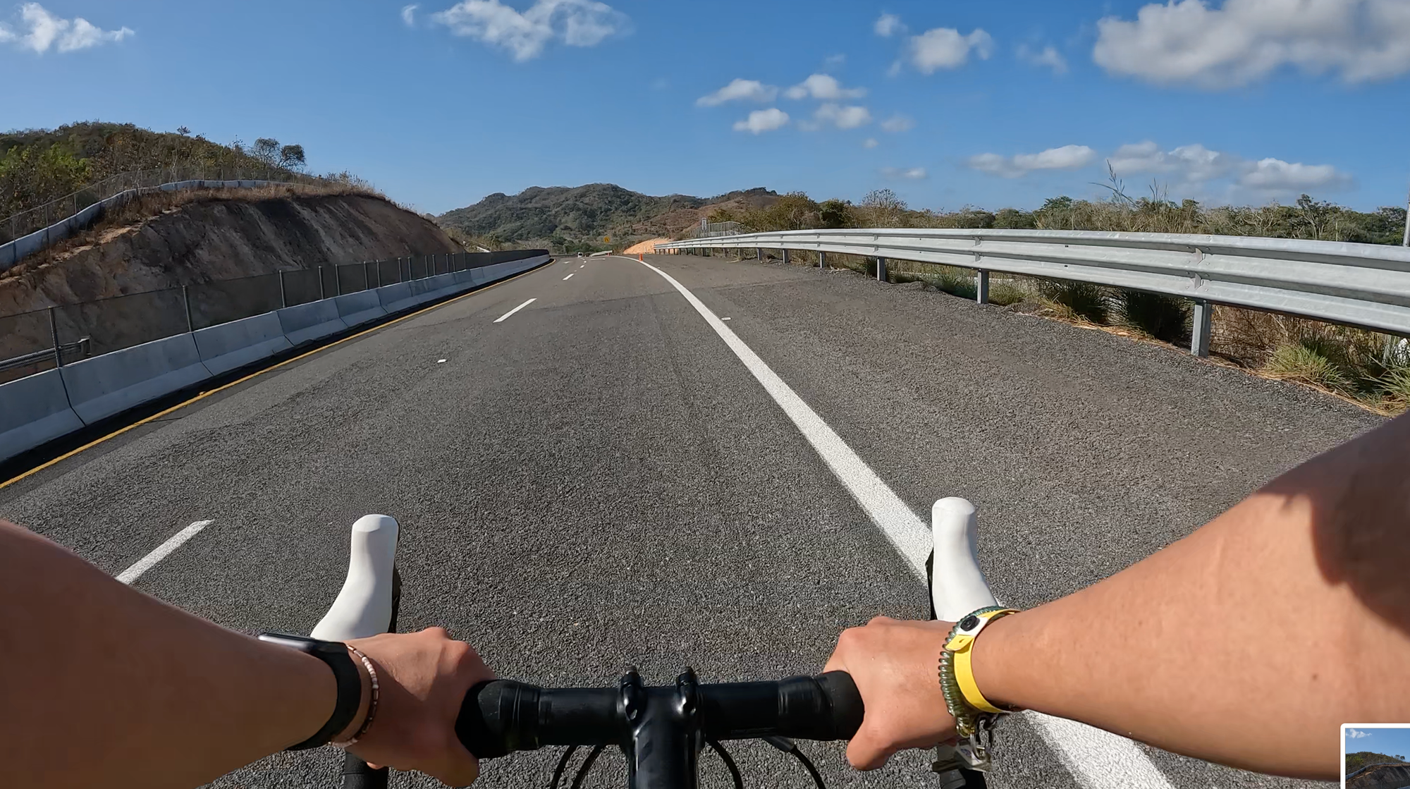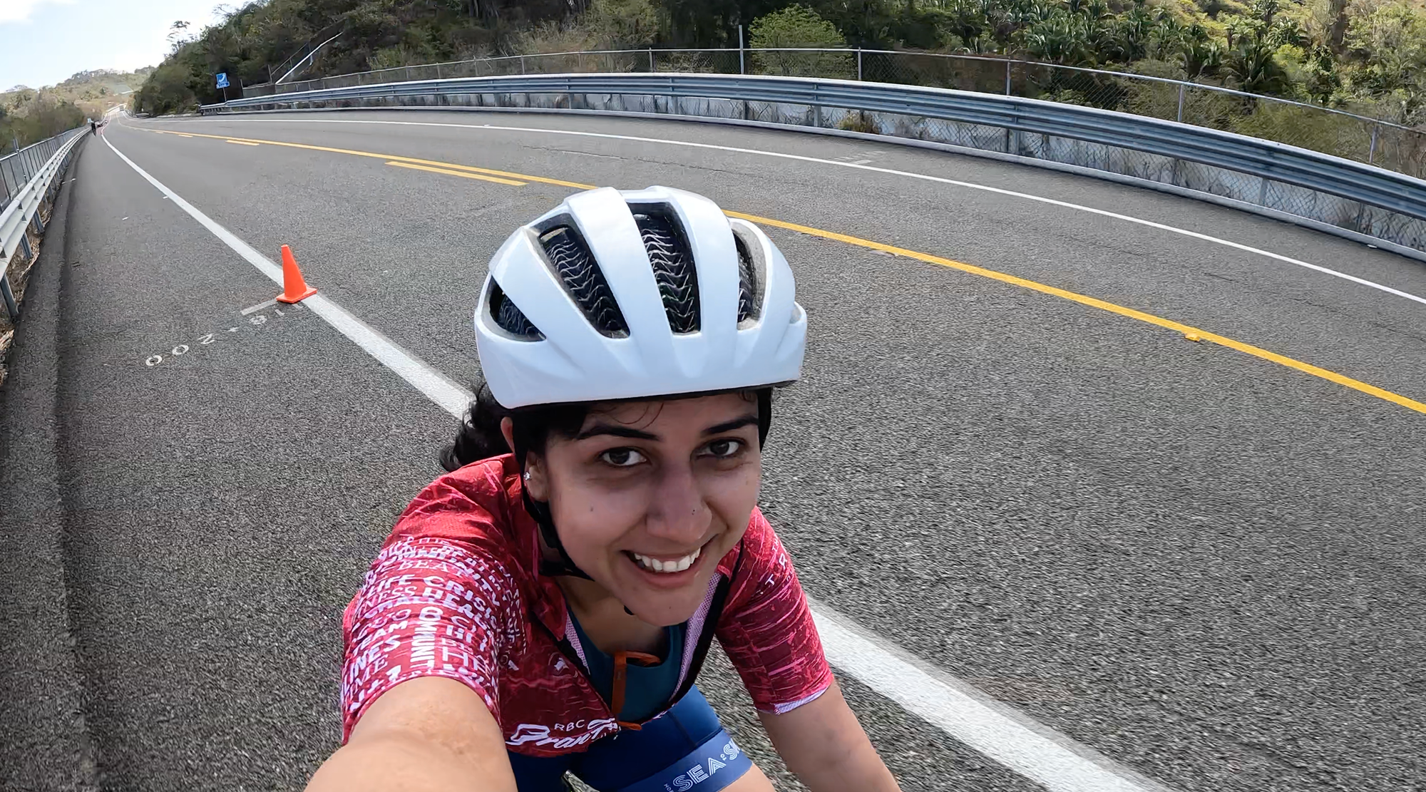 A sign let us know we were entering the first QOM/KOM (Queen/King of the Mountain, basically a timed hill-climb segment): 300 m of climbing over 6.3 km. I geared down and started spinning. It wasn’t too steep — just relentless. Shops with colourful signs advertising chilled Coca-Cola and coconut water made me want to stop and spend my pesos (stored in a Ziploc bag in my jersey pocket like a pro, to keep them from getting gross from sweat). But I kept climbing.